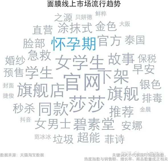 我也是偶然从数据中发现了这股暗流。那几天我正好在看面膜流行趋势,居然在众多描述面膜的关键词中发现了「怀孕期」!在天猫淘宝商家对自己面膜产品的描述中,「怀孕期」这三个字在2018年1至8月期间的热词词云中十分刺眼。