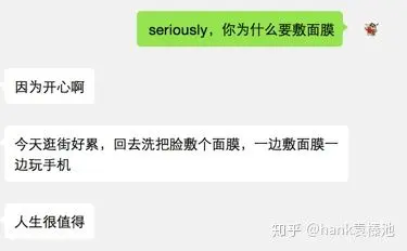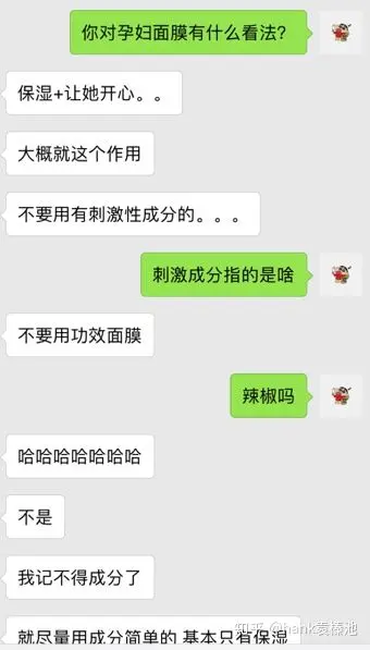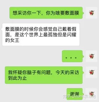 本着探求真知以及关心李哥,我刷知乎补习了一下面膜常识(敷面膜有用吗?),并当面及微信采访了几位女性朋友。这里是部分微信采访记录: