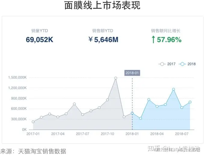 2018年1至8月,线上孕妇面膜的销售额虽然只占整个面膜市场的1/200,但同比增长率却是整体市场增长率的近30倍。这说明,「怀孕期」相关的面膜细分市场展现出极大的潜力,正在被大众逐渐认可。