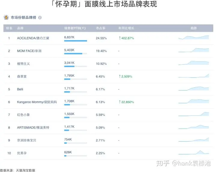 把两个市场中的所有品牌拉出来排个名之后吓了我一跳,面膜大市场斗得你死我活,「怀孕期」面膜市场却都是新品牌占了山头?TOP10的「怀孕期」面膜中,有7个是去年还没在天猫上打「怀孕期面膜」概念的品牌?