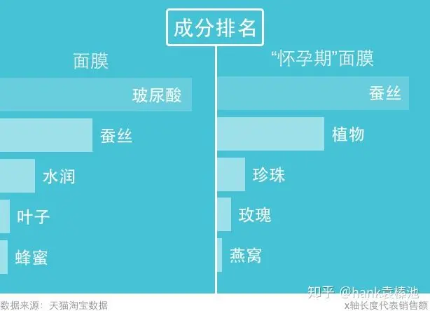 成分上,除了都用蚕丝,「怀孕期」面膜最高销售额相关成分是「植物」,而普通面膜则是「玻尿酸」。