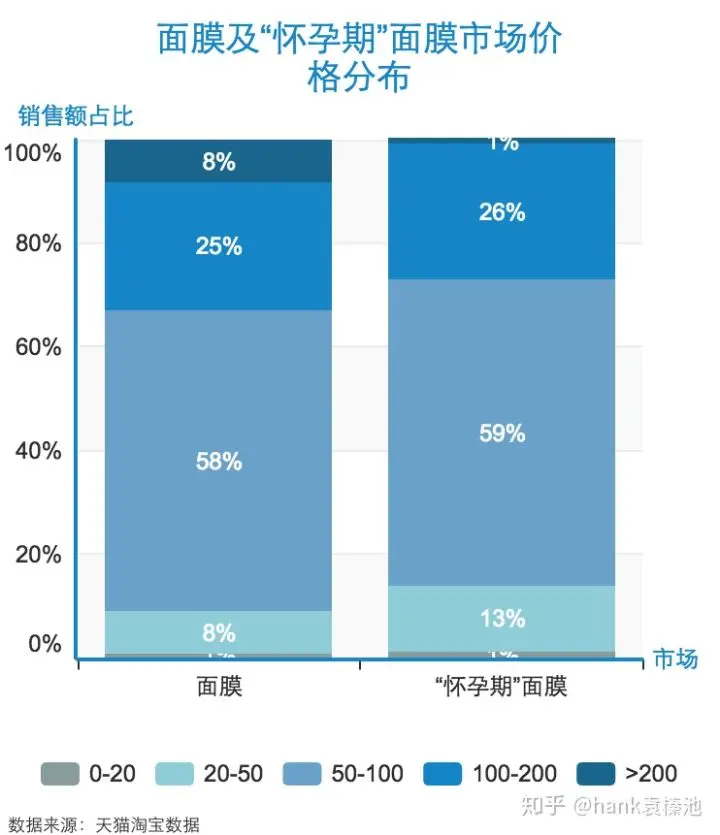 孕妇面膜与其它面膜相比,价格段分布差异并不大,都是集中在50-100元一件,但整体面膜市场在高价格产品上占比更高。