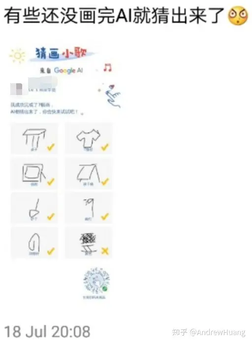 玩家与猜画小歌之间的互动就像是一个你画我猜的游戏,我们是画画的那个人,AI扮演着那个猜画的角色。猜画小歌能在短短的20秒时间里,根据用户绘画的内容,判断出用户绘画的主题,并且最终能有很高的判别准确率。这能力已经令好多玩家对它着迷不已了。