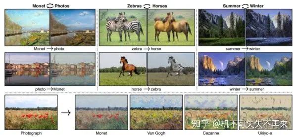 GAN也可以实现风格迁移(通过学习两类图像,能够实现在两类图像间的风格迁移),比如能够把莫奈的画转化为现实中的图片,也可以把现实中的图片转变为莫奈的风格。这是论文Unpaired Image-to-Image Translation using Cycle-Consistent Adversarial Networks (简称Cycle-GAN)的展示研究成果,作者为Jun-Yan Zhu等。
