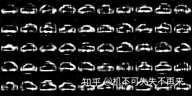 对抗训练100次以后,让此时的生成器画50张汽车涂鸦,可以看出这时的生成器大概只知道汽车是个扁扁的东西,也没意识到汽车涂鸦可以是多样的。