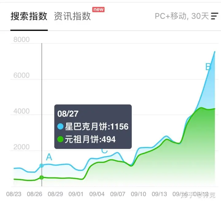 请看百度指数:虽然已到中秋前夜,但吃货们对「星巴克月饼」的关注热情却愈发高涨,相反对于「元祖月饼」的关注度自9月17号以后趋于平稳。这张图不是明摆着说星巴克在中秋节前的最后几天还大有机会吗?