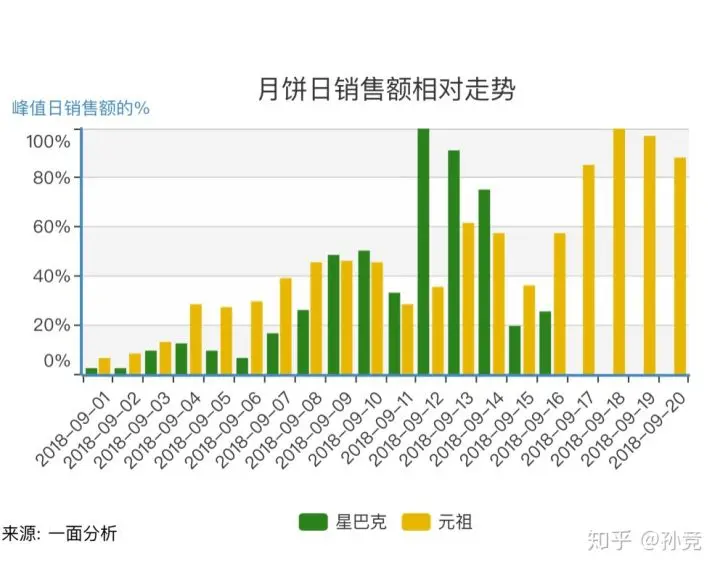 因为比的是走势,咱先不管他们的绝对销售额,两位都以自己的峰值日销售额为100%。星巴克发生在9月12日,元祖发生在9月18日。两者都是旗舰店的数据,因为旗舰店在天猫销售额占比星巴克是97%,元祖是100%。