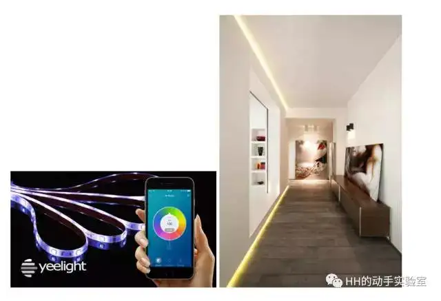 智能灯带也是同样的问题。拿yeelight举例,灯带就只有一个两米的彩光版,而我家里需要的每一段灯带都超过了两米。如果选择传统灯带(飞利浦/雷士/欧普等等),多少米都可以自己说了算,色温有几个阶段可选,价格也从75元每米降到了20元每米。用传统的灯带,再加上一个可远程操作的智能插座,一样可以实现各种联动功能。我家的踏步灯带,就是用这种方式实现的(右上图来源网络,只是个示意图...)。