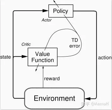 如图 基于策略梯度的actor基于概率来对于某状态来选取动作action;而critic基于actor的行为判别行为的得分;actor进而基于该评价值来计算出来一个td error修改选择行为的概率「换句话说就是:actor的策略梯度的方法生成得到梯度的方向「也就说之前的 logP(\tau;\theta ) 」,然后进行沿着方向进行梯度的增减;我们需要一个值来判断这一个增减的方向是否正确 于是需要critic来计算出来td error」,同时基于选取的action计算TD error来更新critic;
