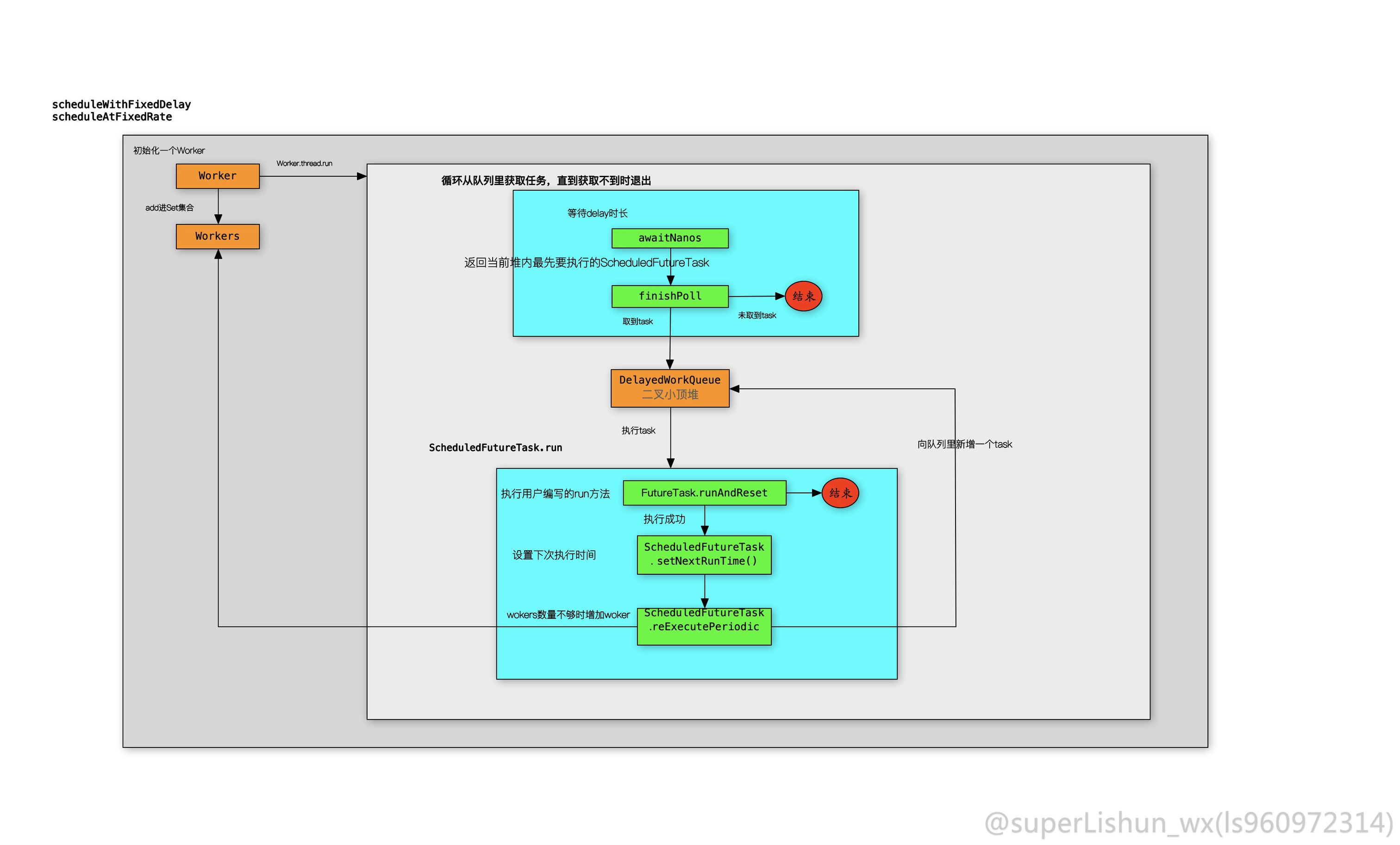 scheduleWithFixedDelay和scheduleAtFixedRate的执行流程都是一样的,如下
