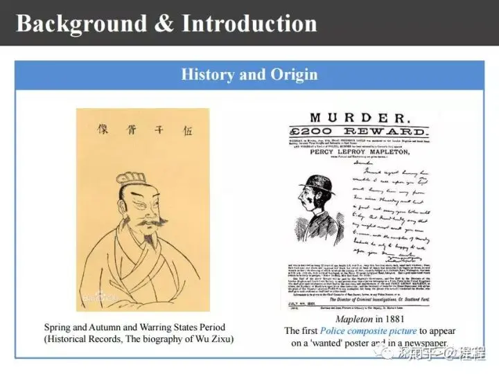 上图左侧是春秋战国时期利用画像追凶的例子,由于伍子胥的画像被挂在了城墙上,他过昭关的时候一夜急白了头。右侧是欧洲1881年报纸上关于铁路杀手追凶的报道,比我们整整晚了2000多年。
