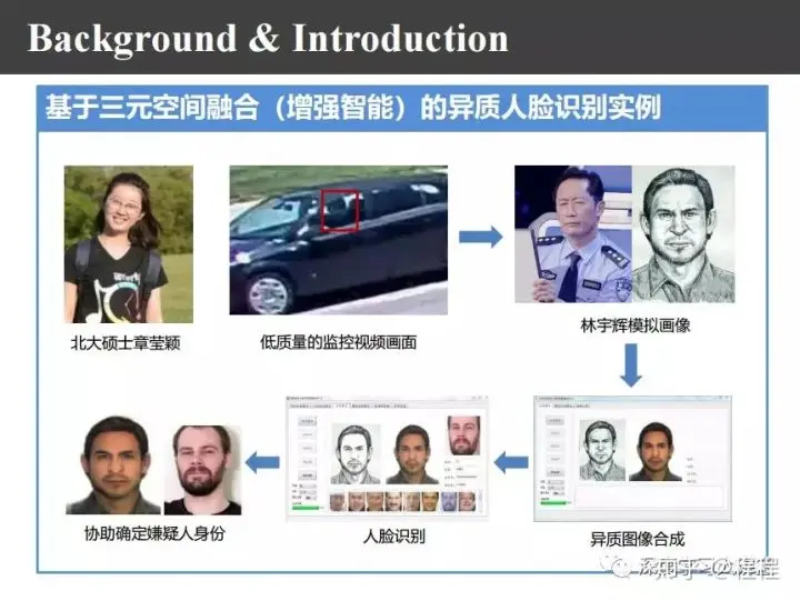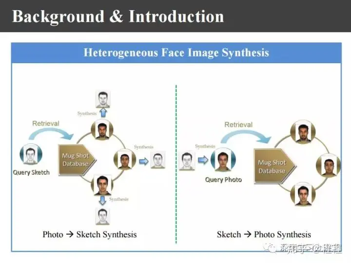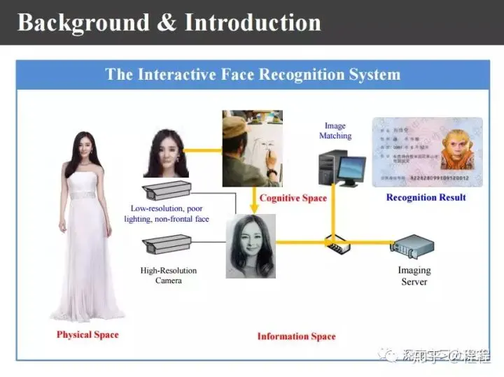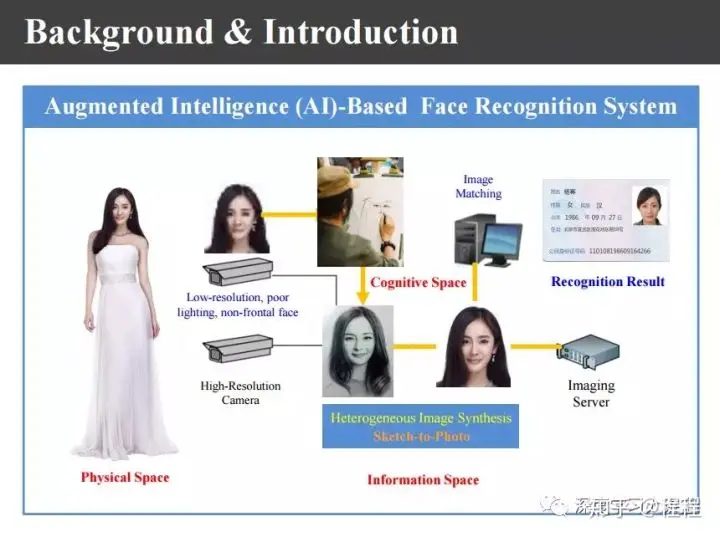 首先,我们来看一下异质图像合成与识别的背景。对于模式识别任务来说,理想的识别系统经过比对以后可以很容易地识别出这个人的身份。上图是理想的人脸识别系统。