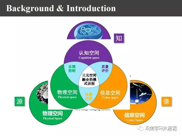 传统的模式识别系统中物理空间的人通过传感器就转变到信息空间去,现在又把人的智慧加进来,形成上图中物理空间、信息空间、认知空间三元融合的空间,这与今天人工智能的一个分支----混合增强智能是完全相关的。