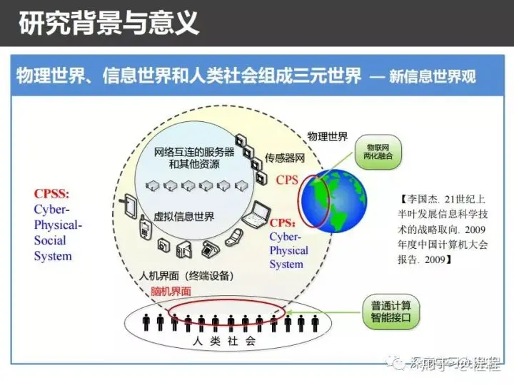 它的哲学基础就是上图李国杰院士提出的新信息世界观:物理世界、信息世界和人类社会组成的三元世界。