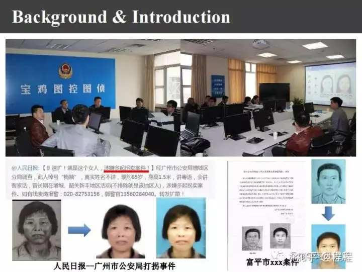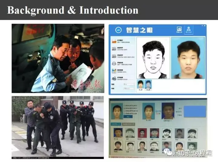 基于画像追凶有实际案例。上图中上方的吉布森女士是休斯敦警察局的职员,她有一次下班时遭到抢劫,因为她是画家就把画像画出来,结果第二天就破案了,从那之后她已经破了2000多个案件。画像追凶来自中国,为什么成功在美国呢?我就在网上搜索了一下,发现我们国家也有这样的人才,比如深圳警察局的李建华同志,利用他的画像追凶已经成功侦破了几个大案,所以画像追凶确实可行。