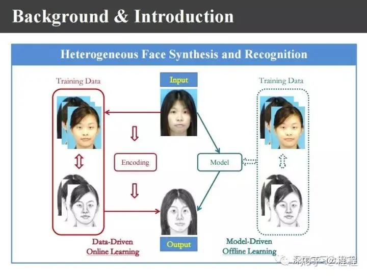 接下来,重点来讲一下讲异质人脸图像合成和识别。关于异质图像的合成和识别我们做了将近十几年的工作,我今天系统总结一下。整个工作可以分成两大类,一种是基于online学习的data-driven的方法,通过输入照片以后,利用训练照片画像对来合成画像或者由画像合成照片。而offline学习的model-driven的方法则是通过机器学习学到model以后,不再需要训练样本,将输入通过映射函数得到生成的画像。