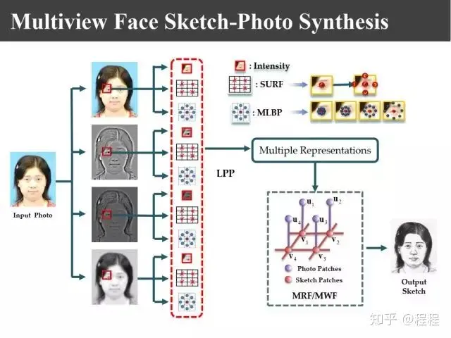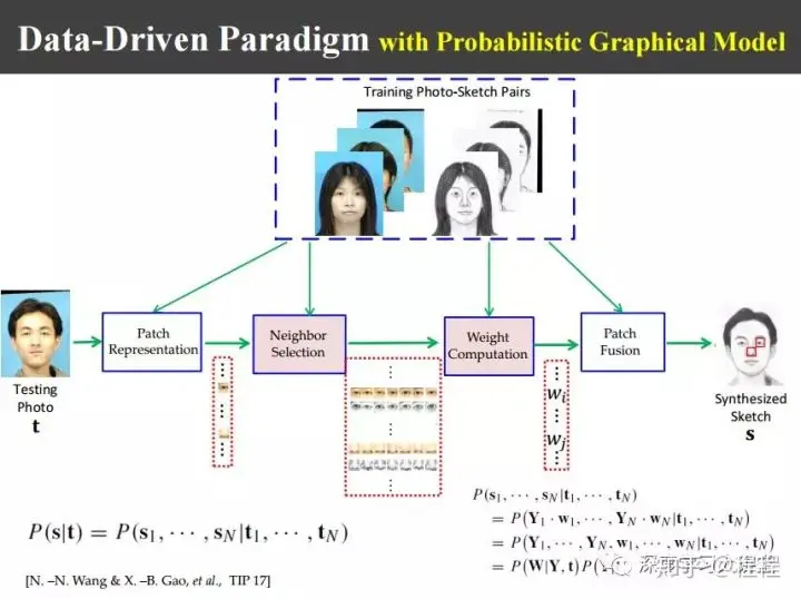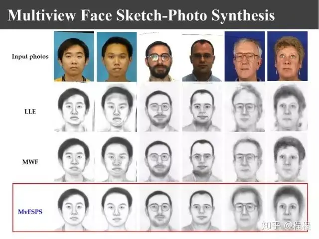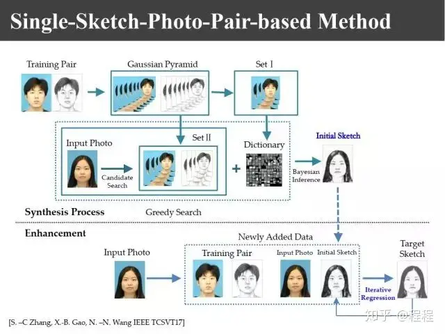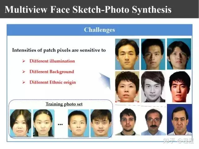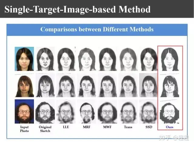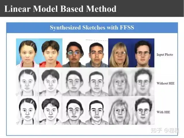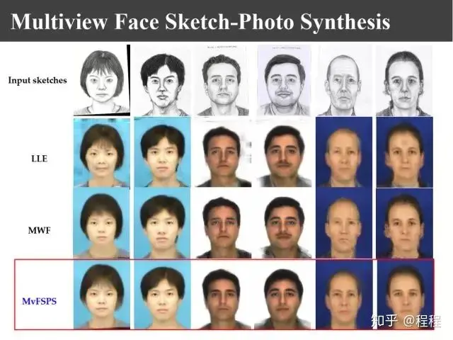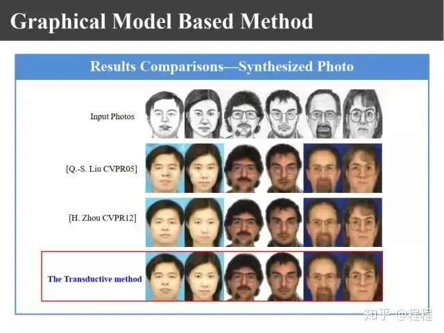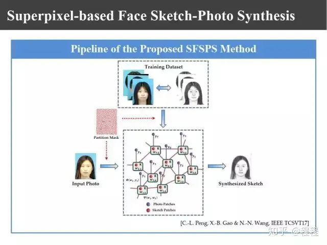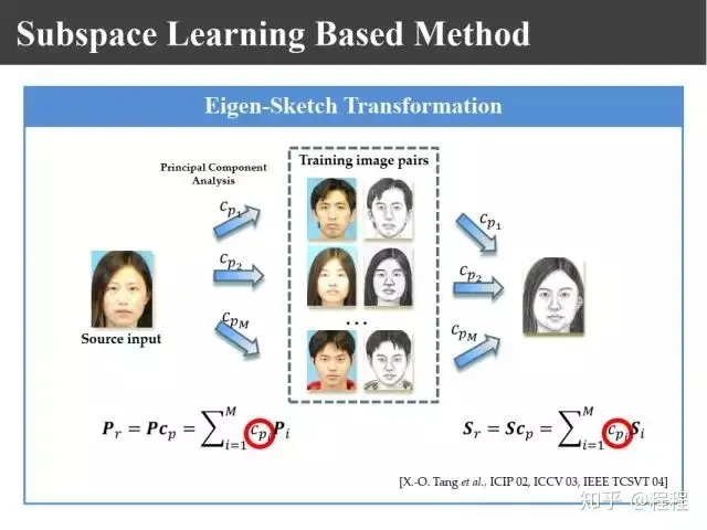 上图是汤晓鸥教授最早在ICCV2003上发表的一个名为Eigen-Sketch的工作。利用Eigenface的思想,对照片利用训练样本进行线性组合生成,得到照片线性组合的系数以后,将组合系数叠加到画像上,可以合成出画像。这是最早的异质图像合成的工作,也是奠基性的工作。