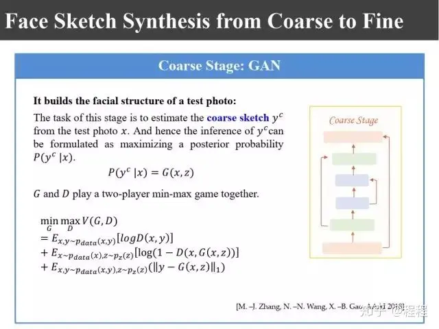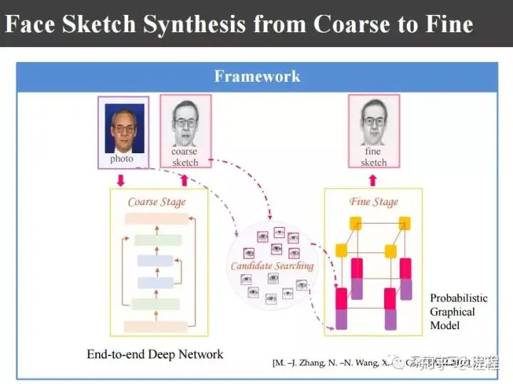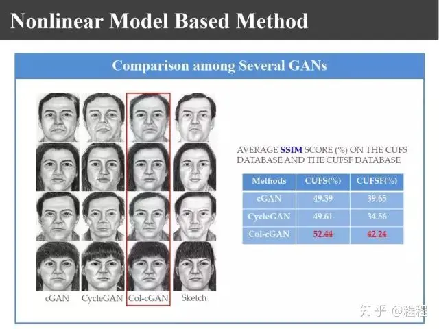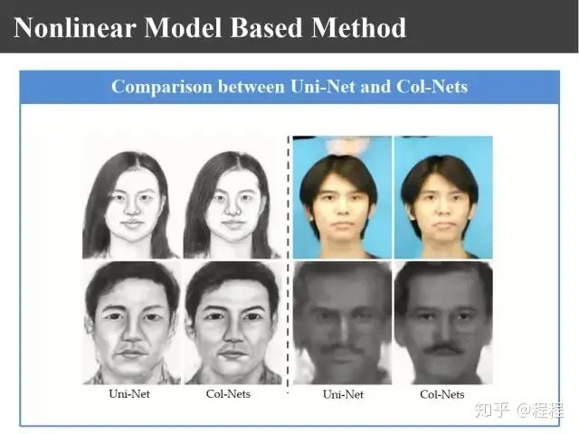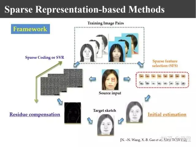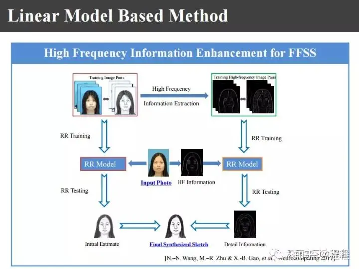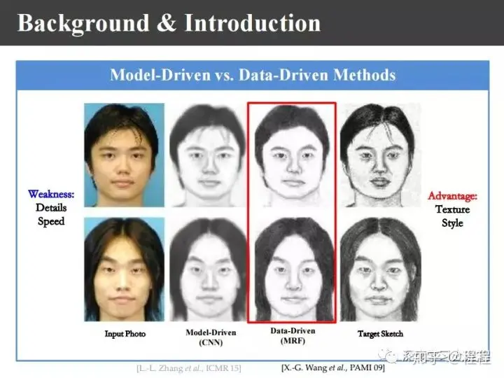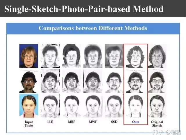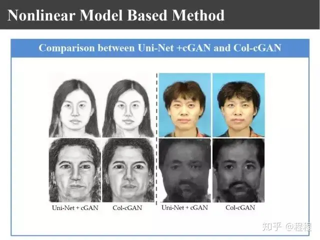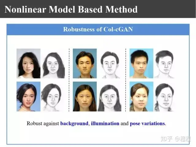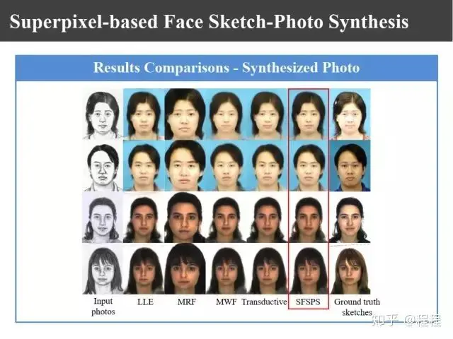 上图是汤晓鸥教授最早在ICCV2003上发表的一个名为Eigen-Sketch的工作。利用Eigenface的思想,对照片利用训练样本进行线性组合生成,得到照片线性组合的系数以后,将组合系数叠加到画像上,可以合成出画像。这是最早的异质图像合成的工作,也是奠基性的工作。