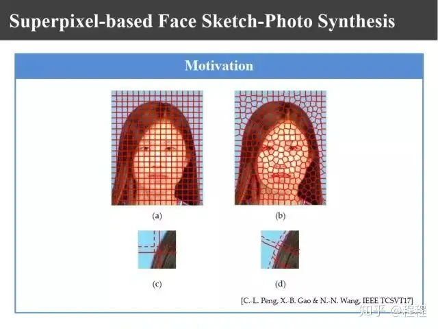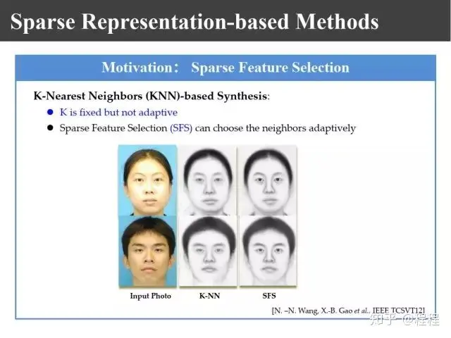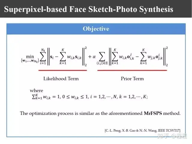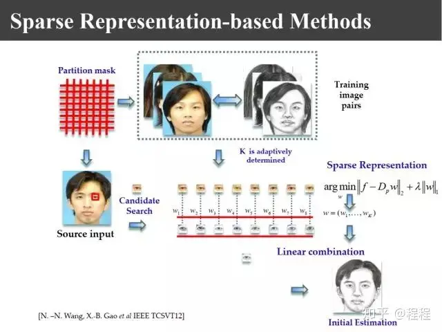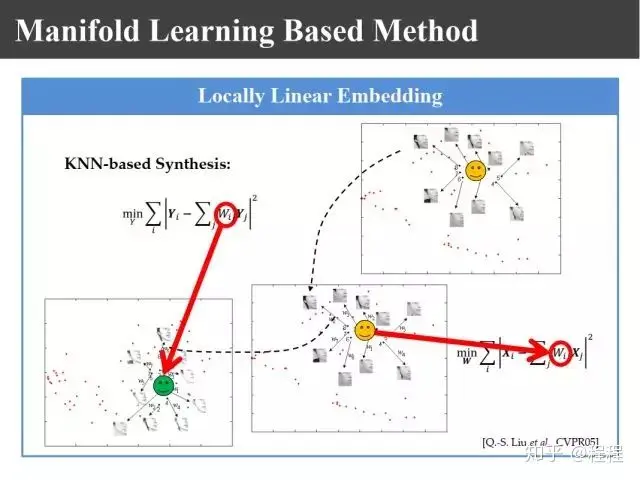 上图是刘青山教授在CVPR2005上提出的改进工作。受启发于当时如火如荼的流形学习,他认为把整幅图像进行合成的做法存在不足,他利用LLE的思想把照片分割成一个个照片块或者画像块,再对每一块进行线性组合,组合以后把对应画像利用对应的系数合成照片,这样就把整幅图像的线性转变成局部线性嵌入。