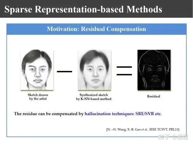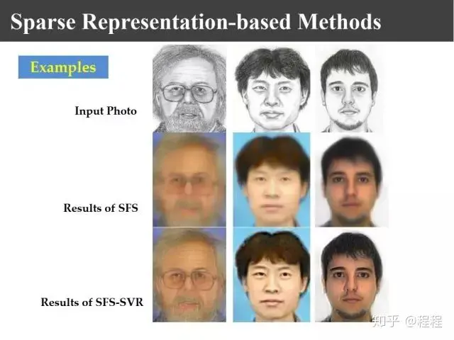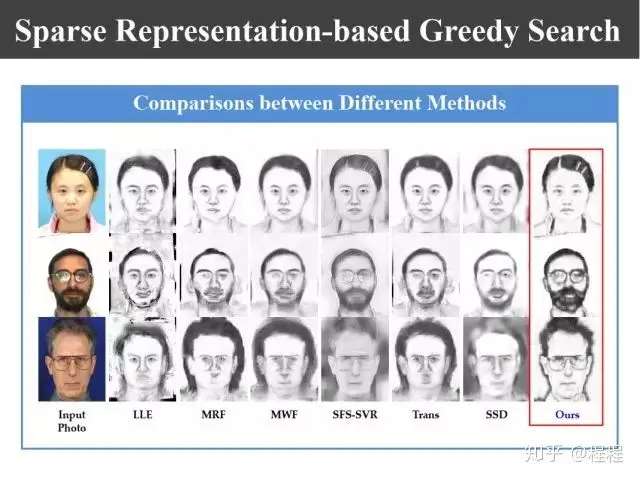 实际上,基于data-driven的方法也还存在其它问题。比如,上图所示的训练数据库里面没有出现的情况我们很难合成出来。比如说背景不一样,或者训练数据库里面都是年轻人,香港中文大学的数据库中的照片都是年轻人的,如果合成老年人,它的皱纹很难合成出来;如果数据库里面没有戴眼镜的,要想合成戴眼镜很难,因为我们眼睛的合成区域总是找相应的眼睛区域来合成的。这样就使得合成出的画像与待测试样本之间有差别,为此我们利用稀疏表示和贪婪学习的方法设计新的方法,就是进行全局搜索。