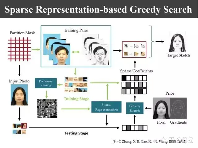 原先我们的合成是基于local mean的,这个新的学习算法实际上是一个nonlocal mean。nonlocal mean存在一个问题,如果我们要搜索一个眼睛的话,需要在整幅图上搜索它的近邻区域,这样的整幅图像搜索速度非常慢,为此我的团队提出了上图所示的基于稀疏表示的贪婪学习方法。利用训练样本我们可以构造一个字典,把每一个图像块利用字典来表示,得到基于字典的表示系数,形成一个稀疏系数矩阵,这样来一个测试图像以后,同样的也可以用字典来表示成一个系数序列。进行匹配的时候就像一个哈希搜索一样就变得非常快,这样一来就解决了快速全局搜索的问题。