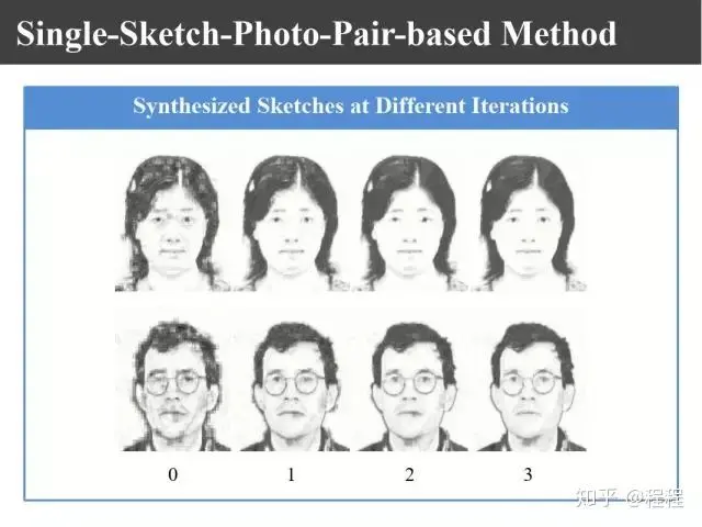 这样如果只有一个训练对的话,利用高斯金字塔可以生成一系列不同尺度的照片和图像对。可以通过合成字典,同样利用刚才讲的贪婪学习方法合成出初始的画像。然后把训练样本和测试样本生成的初始画像这两对放在里面进行迭代,依然可以生成高质量的合成画像。