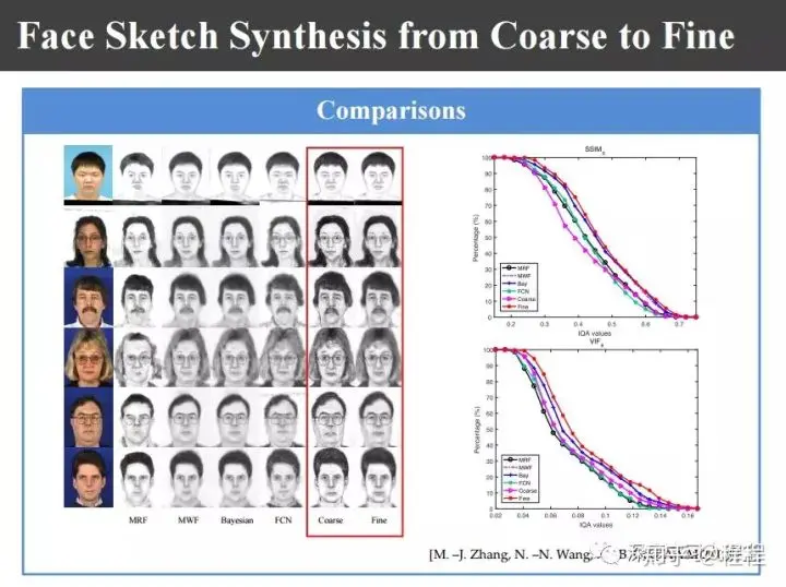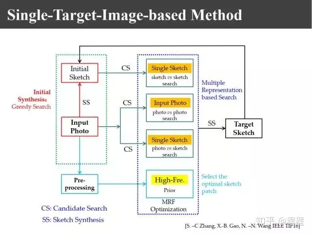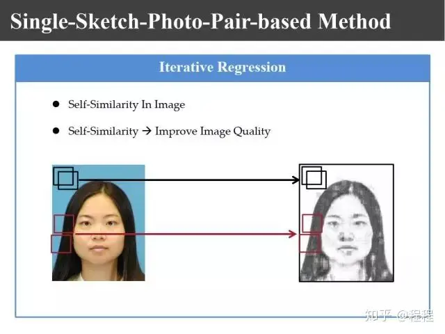 首先利用贪婪学习算法生成初始的画像,然后利用照片和画像,分别使画像和画像匹配去寻找K近邻,基于照片和照片匹配去寻找K近邻,基于照片和画像匹配去寻找K近邻,由于画像和照片它的高频分量比较吻合,利用它做先验知识来选择一个最佳的K近邻然后进行合成,最终进行迭代以后仍然可以得到好的结果。