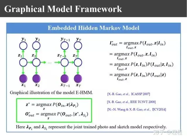 上图是我们在2007年的时候提出的嵌入式模型合成方法。把画像和照片看成是观测序列,同时存在一个隐含状态和状态转移空间,利用状态转移矩阵得到合成模型,然后基于该模型实现画像或照片的合成。2014年在IJCV上我们对它做了新的解释,完全可以用最大后验概率或者概率图模型进行解释,这样我们就把它统一到概率图模型的框架上去。