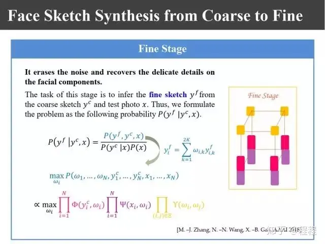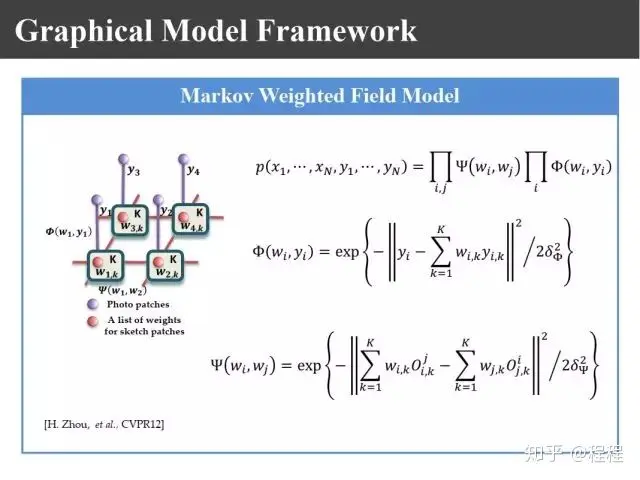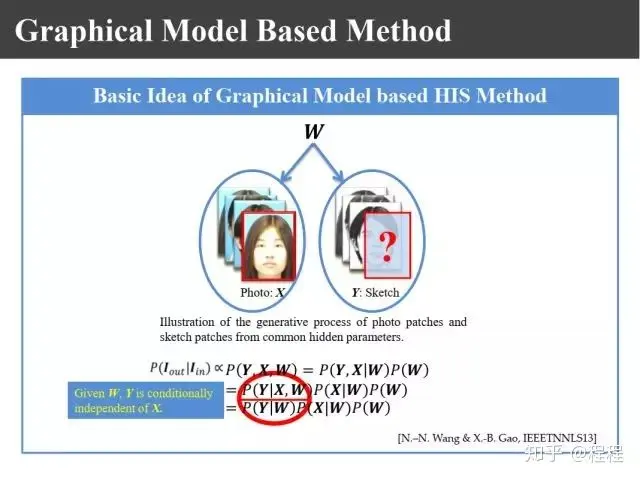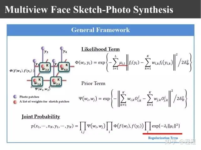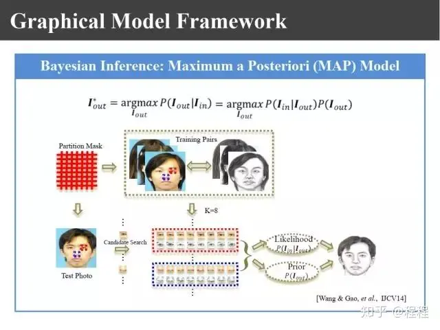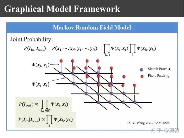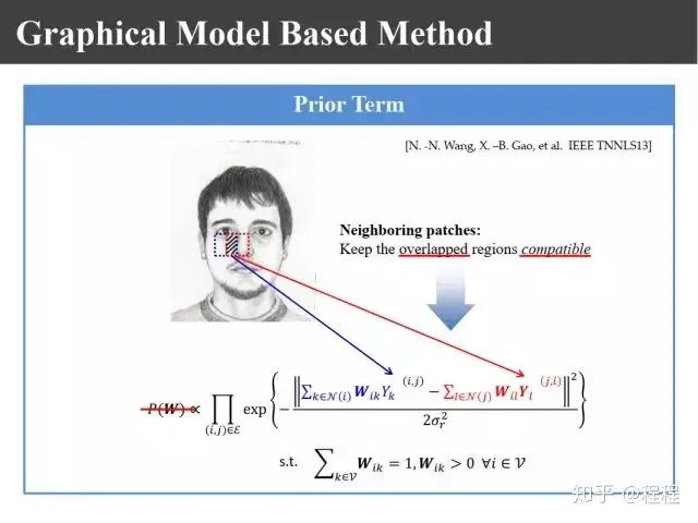 09年在PAMI上有上图所示的王晓刚教授的一个工作,提出了利用马尔科夫随机场理论来进行画像的合成。过去我们生成画像块的时候只是利用照片和画像之间的关系,其实要生成画像的话,相邻画像块之间也有约束关系,为此提出了嵌入式的马尔科夫模型。这里面就有两个似然函数,一个表示画像和照片之间的关联性,一个表示画像块之间的兼容性。
