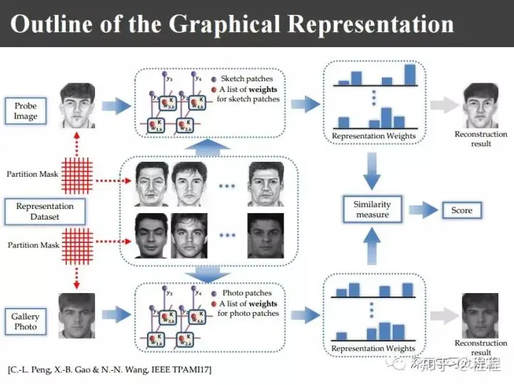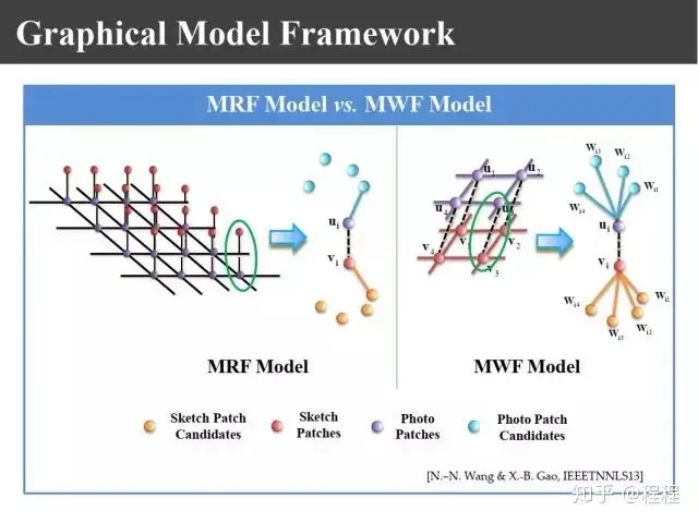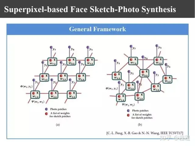 上图是香港科技大学学者在CVPR2012提出马尔科夫加权随机场模型。在考虑块和块之间的关系时,把每一块又使用k近邻来表示,变成k近邻和k近邻之间的约束关系,同样分为画像和照片之间的关系和照片和照片之间的关系。