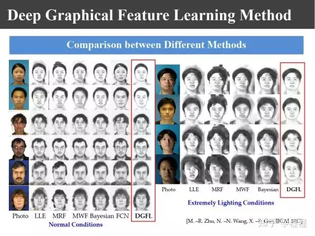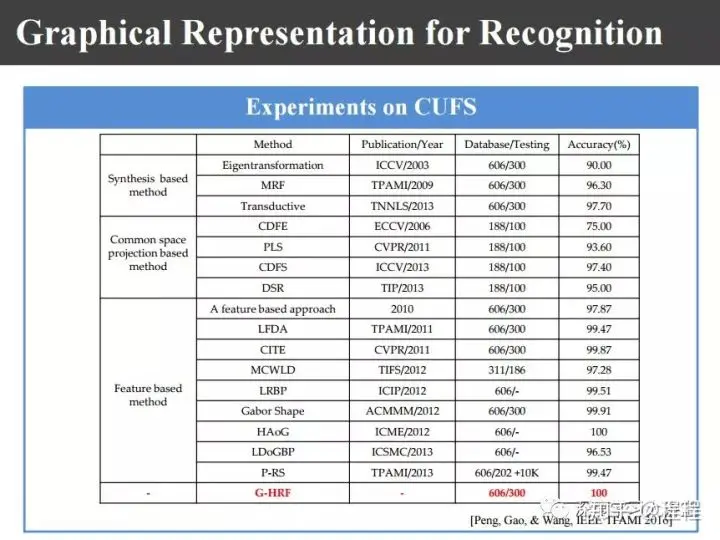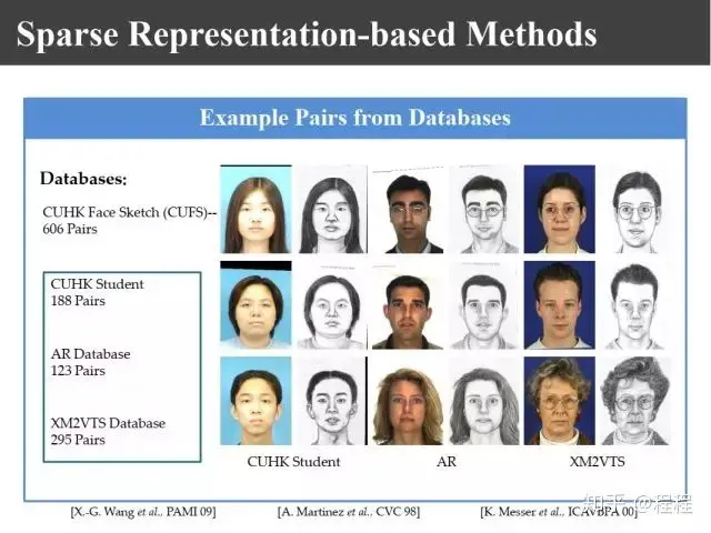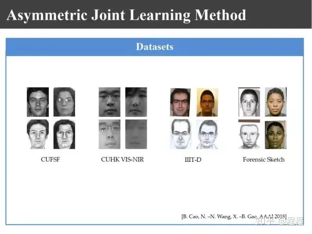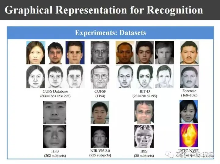 上图是不同的数据库,包括香港中文大学的CUFS和CUFSF数据库,印度的IIIT数据库,网上的数据库,照片、可见光和近红外的数据库,可见光和热红外的数据库。这里所谓的异质图像是指不同传感器得来的图像。