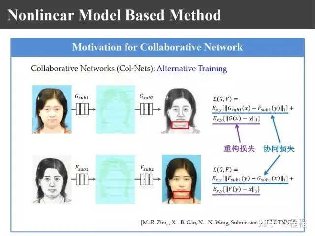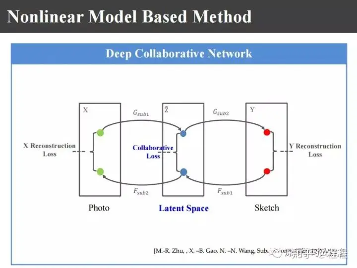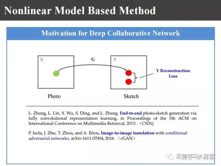 最近,大家都比较熟悉所谓的基于端对端的学习,还有上图基于conditional GAN的方法。不管是照片还是画像,把它映射到另外的异质图像域里,在这个图像域计算它的重建损失reconstruction loss。