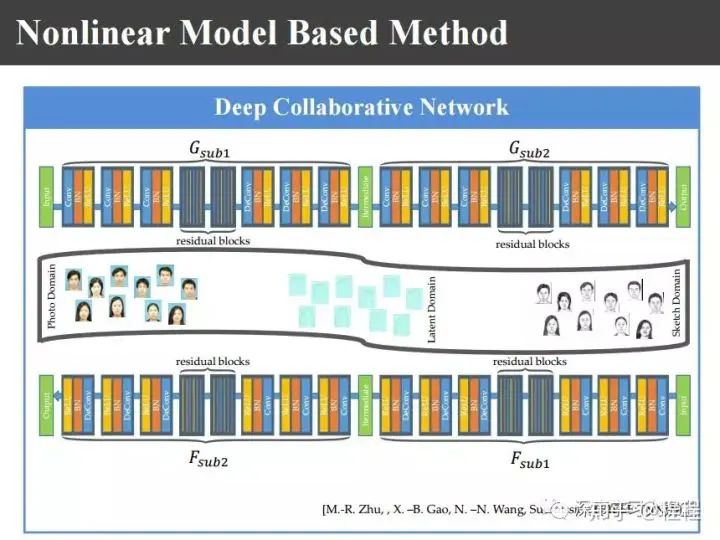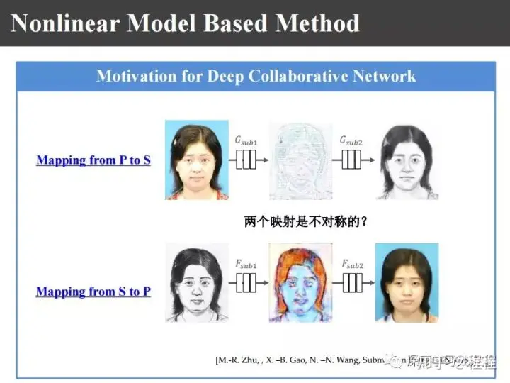 这样一来我们希望把画像和照片、照片和画像之间两个映射在隐空间里面达到相似,这样一来我们提出上图的深度协同网络。