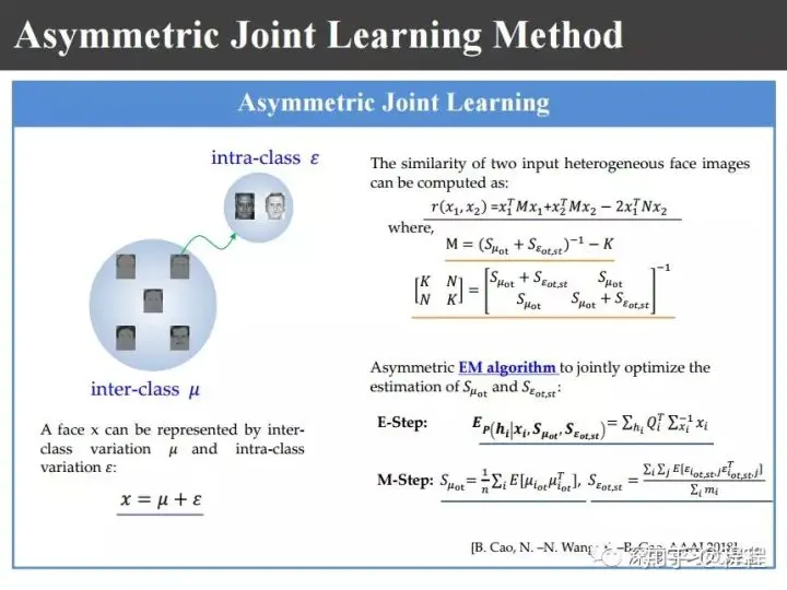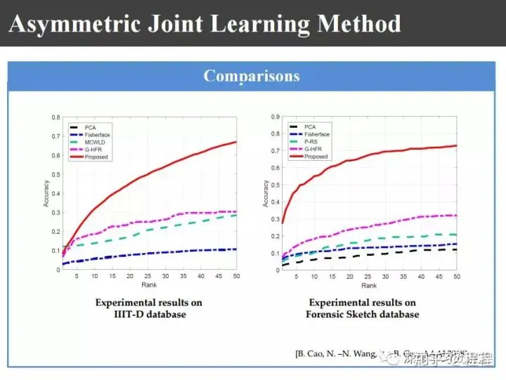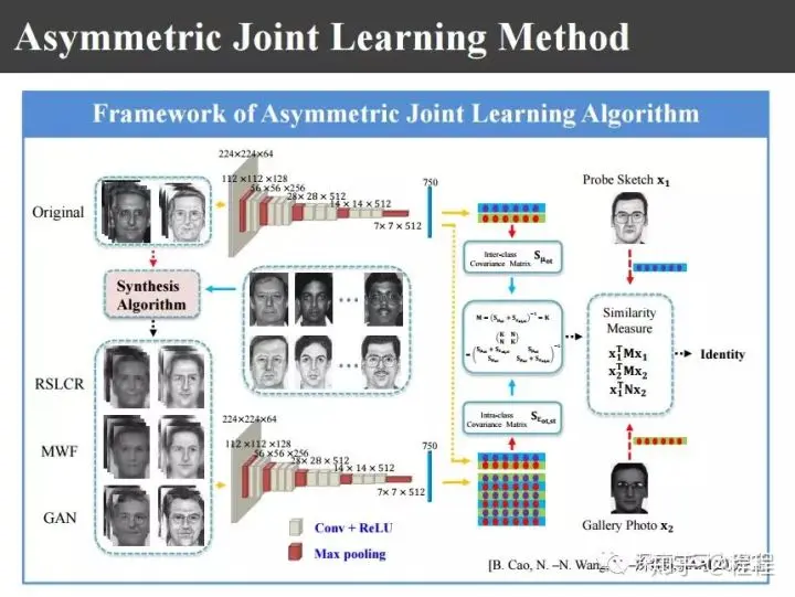 为此我们就提出上图非对称联合学习的识别方法。也就是说,有了照片和画像以后,用不同合成方法都去合成出一些画像和照片来,利用这些信息可以来学习对应不同个体的图像的类内方差,这是为后来的识别服务的。也就是说我的画像和照片对,有了画像和照片数据库以后,把数据库里面的照片和画像都用不同的合成方法合成出一些新的图像对。提完特征以后,利用这些特征提取类间的协方差矩阵和类内的协方差矩阵。类内的协方差主要是因为使用不同的方法合成的,类间的主要还是因为训练不同的数据库里的图像,所以说蛇是一个非对称的学习。