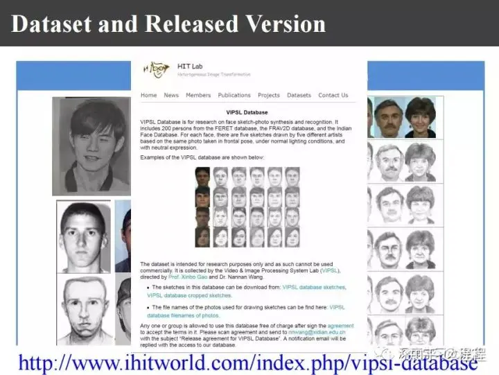 另外相关的数据库也非常难得,有的画像是看着照片画的,也有看一眼之后根据记忆画的,这种就更难了,真实应用的时候都是根据记忆来画的。现在我们找美院学生对不同照片由5个人来画了画像,这个画像已经在网上release。如果大家有兴趣的话,可以到上图的网站上去下载,可以去进行测试。