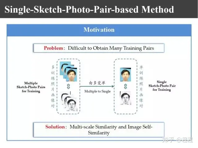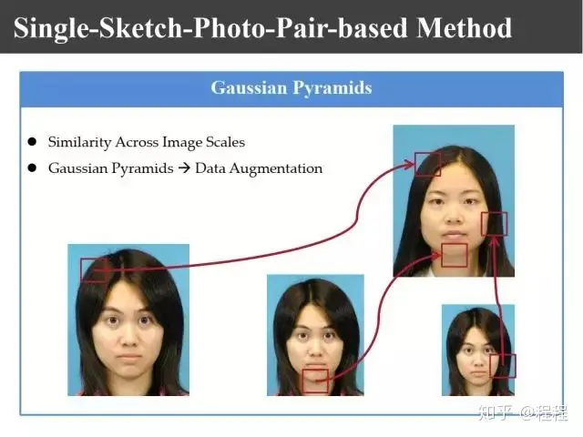 前面的学习都是基于大量训练样本的,如果我们有一个应用只有一对训练样本怎么办?也就是说我们的训练只有上图所示的一个照片和画像对,它也是可以工作的。因为可以利用人脸的多尺度构造更多的图像,一个大人通过缩放可以变成小孩;另外一个图像里面有自相似结构,比如左脸和右脸非常相似。