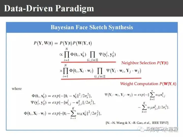2017年的工作是把前面的相关工作进行了系统总结。我们发现整个算法流程基本上分为几个模块:对于给定的训练数据库,首先要对每一幅照片-图像对进行分块,进行图像块的描述,也就是说怎么来表示每一个图像块,另外就是近邻块的搜寻,怎么来寻找最近邻图像块,另外是怎样优化加权的权值W。