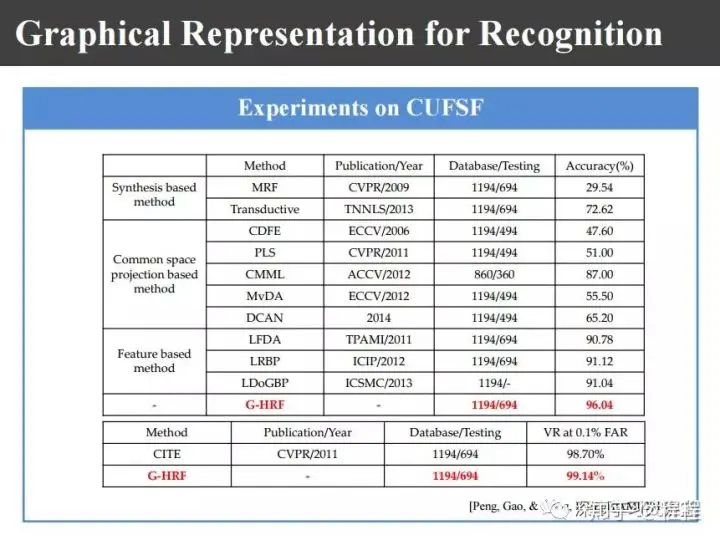 在上图不同数据库上做识别以后,我们现在识别结果在CUFSF数据库上可以达到99.61%,在CUHK VIS-NIR数据库上达到99.05%。