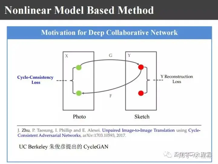 后来UC Berkeley的朱俊彦博士提出了上图的CycleGAN,对照片或者图像映射到异质图像域以后再反映射回来,在原始图像域计算Cycle-Consistency Loss。比如,在超分辨重建的时候没有高清图像,在这高分辨域没办法算Loss函数,还要再反映射回来在低分辨域计算它的Loss函数。
