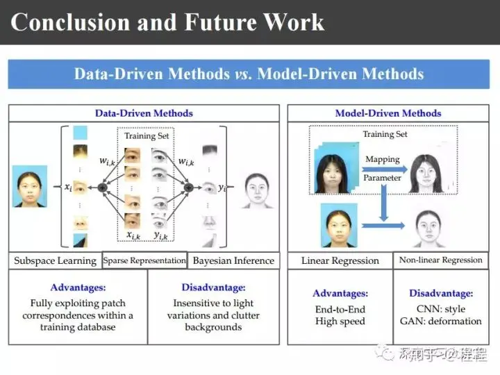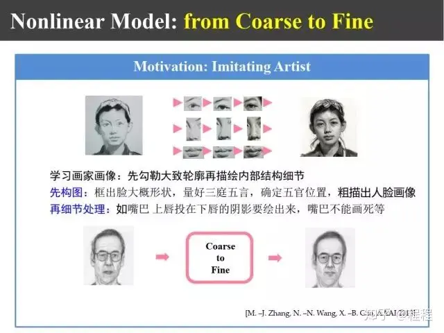 上图是一个基于线性模型的方法,基于Ridge Regression脊回归的简单工作。给定一幅图像之后,我们首先进行区域划分,分成头发区域和人脸区域,对于头发区域利用mini batch K-means算法进行聚类,聚类以后对类内进行脊回归;对于人脸区域仍然找它的近邻,眼睛找眼睛区域,鼻子找鼻子区域,对每个区域基于位置进行脊回归,然后把两部分回归的结果进行组合之后就可以得到合成的画像。