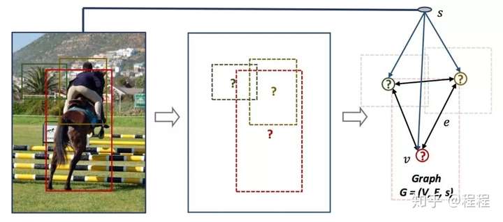 自然而然,我们的动机就是不仅仅依赖物体视觉特征,同时利用场景上下文和物体关系来联合推理解决物体检测问题。我们认为自然场景图是一个有机的结构体,如图2所示,包含三种视觉概念分别是场景、物体、物体间关系。在场景的指导下,物体之间通过关系程度相互交互。所以我们将问题形式化为一个图结构G=(V,E,s),其中V是节点node代表ROI,E是边edge代表ROI之间的关系程度打分,s是场景scene描述。通过图结构中的元素联合推理交互,物体状态得到丰富的表示再用于分类和位置refine回归。下面首先需要对图结构中的三元素进行建模,再设计相应的交互机制来相互传递信息。
