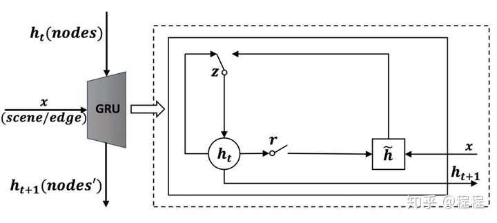 在场景指导下,物体之间通过关系程度相互交互,其实就是物体接收场景的指导信息,每个物体接收其他物体传递来的信息,只不过关系不同,接收程度不同。所以交互机制也就是消息传递,我们这里采用GRU来实现,如图4所示。例如当前物体需要接受场景的信息,那么将当前物体的状态作为隐状态,场景信息作为输入,输出即接收信息更新后的物体状态;同理当物体需要接受其他物体的信息,同样将当前物体状态作为隐状态,其他物体传递来的信息作为输入,输出即更新后的物体状态。GRU的Gate结构可以使得隐状态丢弃与输入无关的部分,也可以选择与输入相关的部分根据输入来更新隐状态。所以GRU本身是一种很巧妙的实现消息传递的方式。
