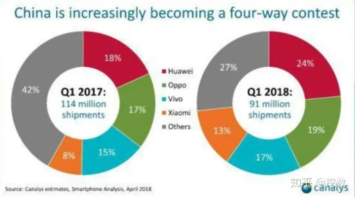 2017年不管是Android还是IOS,智能手机的出货量基本没有增长,2018年甚至可能下降,关联另外一份数据可以看到中国2018年Q1的出货量下降了20%