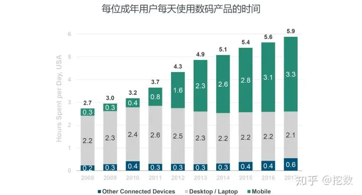 虽然电视的使用时长还是第1位,但已经呈下降趋势,正被第2的移动设备迎头追赶,上图还指出移动端的广告投放目前还有3%的增长空间。