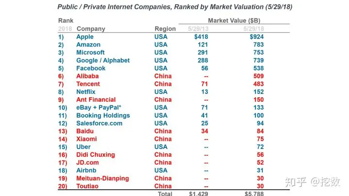 全球市值Top20的科技公司中国占据一半,值得注意的是中国市值前3的公司中阿里巴巴和蚂蚁金服占2席。