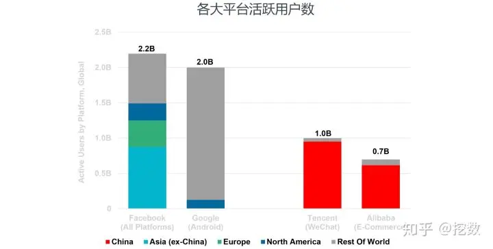中国互联网巨头相比Facebook、Google,海外用户占比稀少,主要靠国内人口红利崛起。