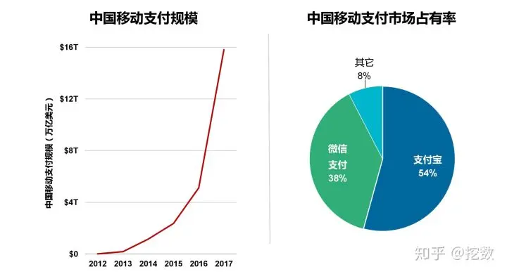 移动支付上,微信占有率落后支付宝16%。