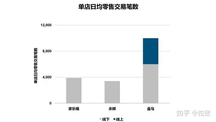 结果就是盒马的 单店日均零售交易笔数 碾压传统超市。