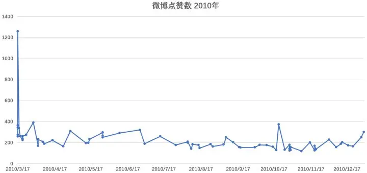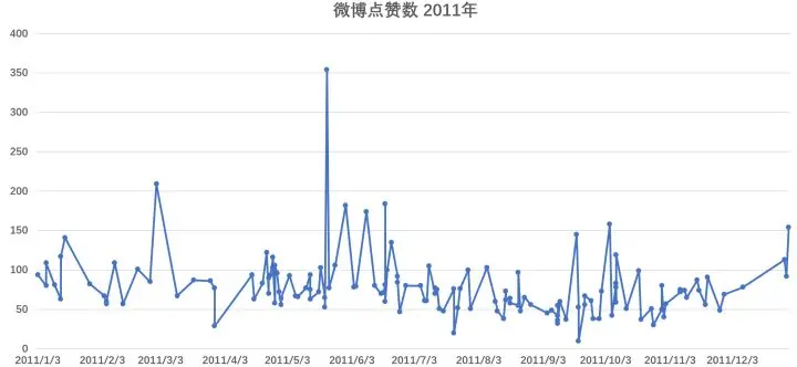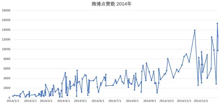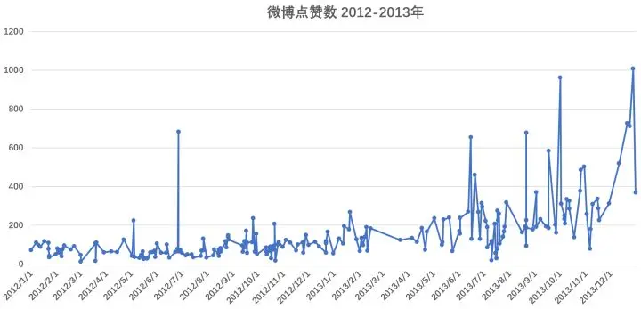 2012-2013年,平平无奇的2年,微博被点赞数在 50-300 之间,到 2013年尾,可以看到有一些起飞的趋势。