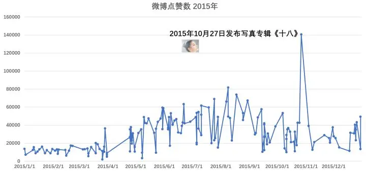 2015年,她的微博被点赞数在 2-5万 之间,一年到头基本是在宣传她的神作《浪漫天降》,以及参演的电影《左耳》。